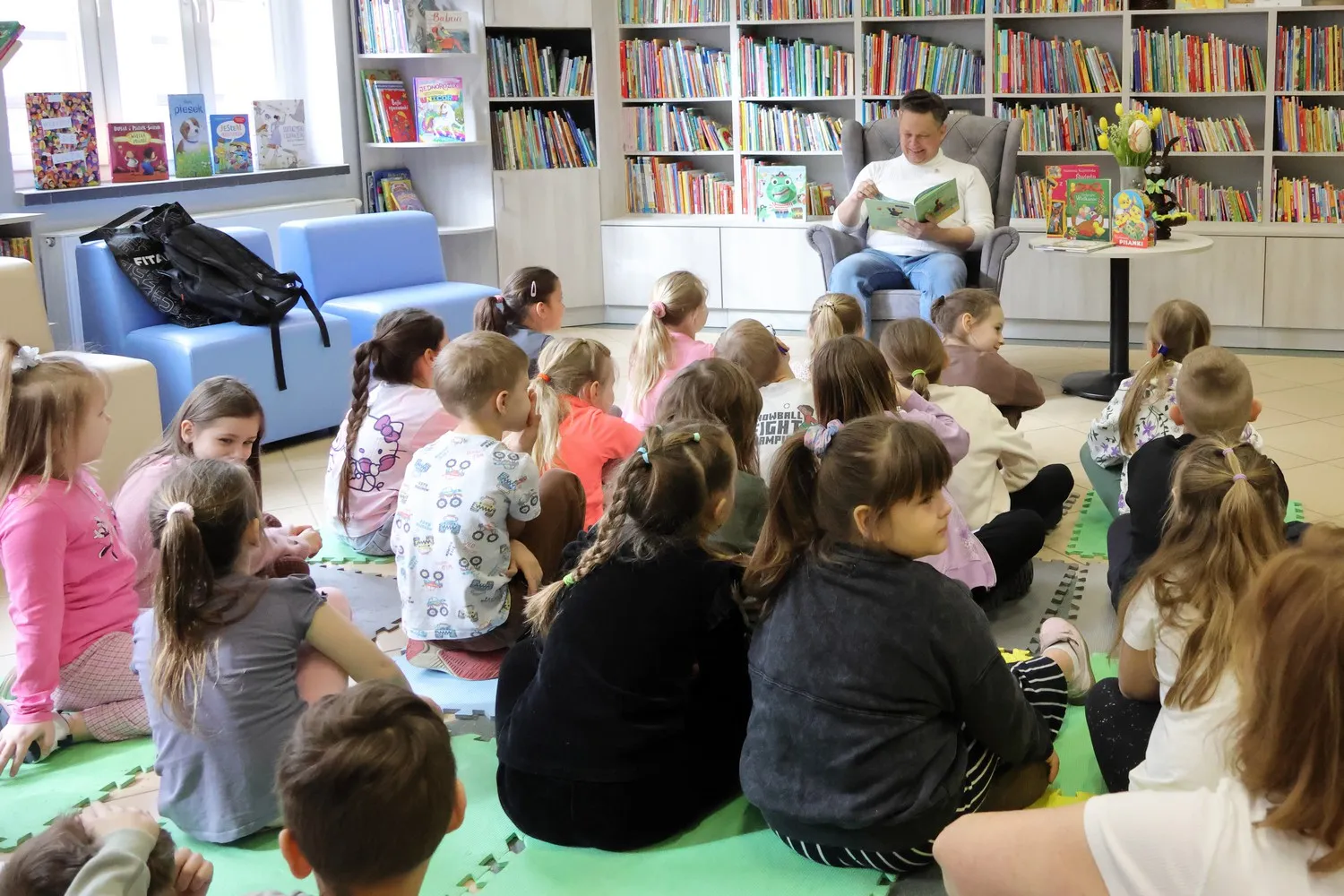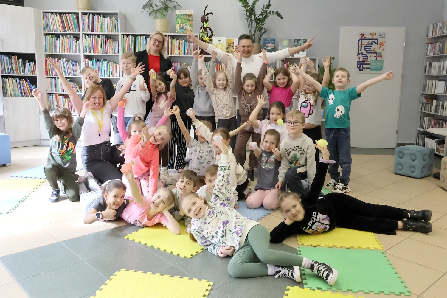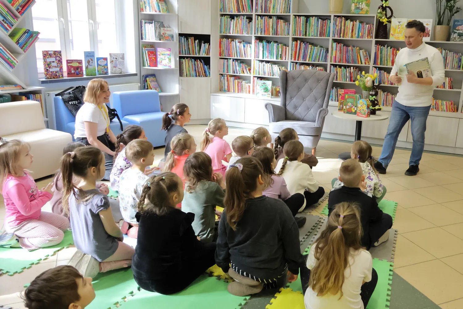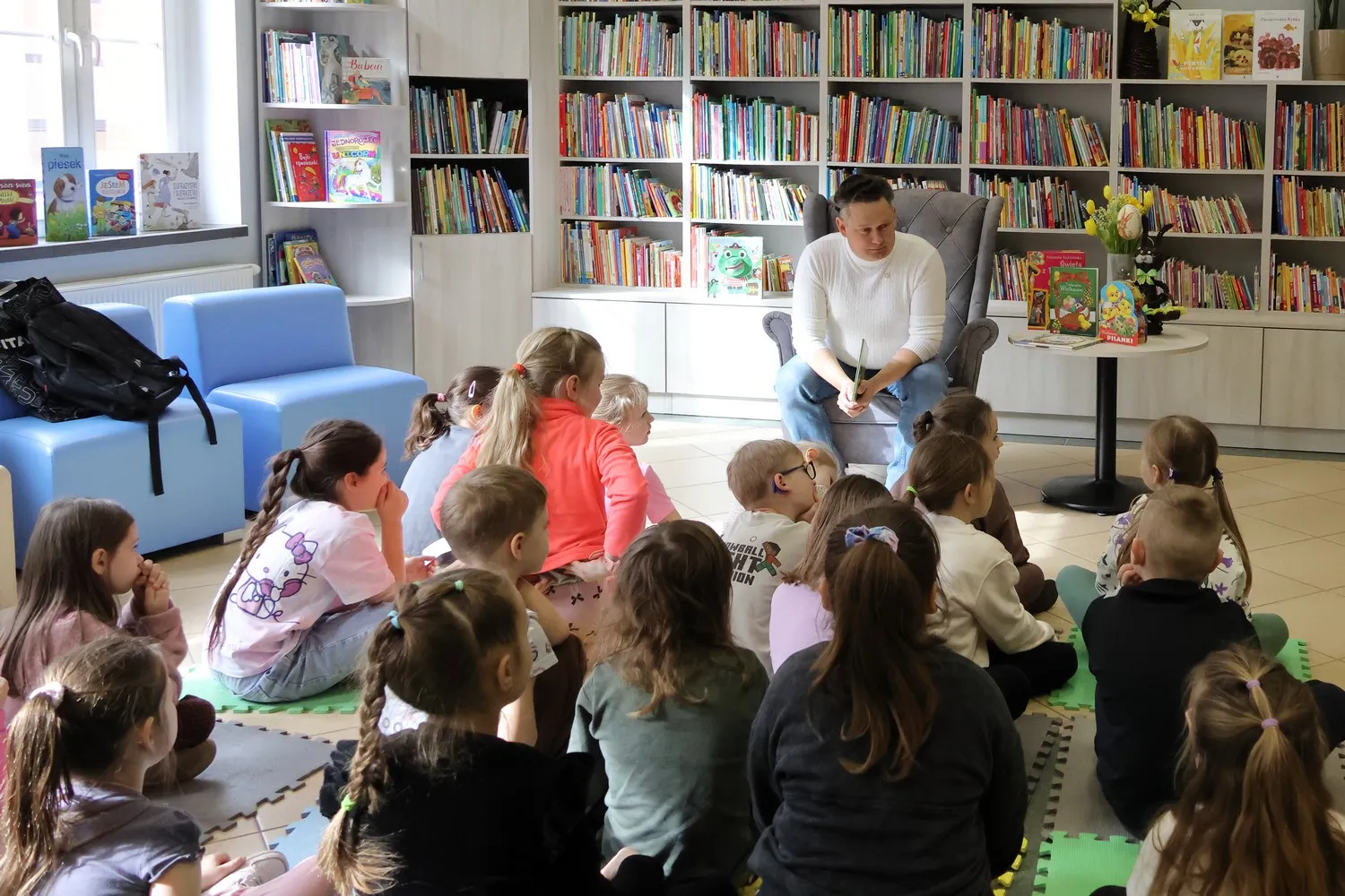 Dziś Bibliotekę Publiczną w Gołdapi odwiedziła klasa 1b ze Szkoły Podstawowej nr 1 w Gołdapi, a zaszczyt przeczytania fragmentów dziecięcych opowiadań przypadł dla mnie. Dotyczyły one wielkanocnych tradycji: malowania jaj i śmigusa-dyngusa. Czytanie było jednak tylko małym fragmentem naszego spotkania. Przede wszystkim mogliśmy porozmawiać o Wielkanocy, o tym, jakie mamy świąteczne marzenia, z czym kojarzą się nam święta czy kogo najchętniej byśmy oblali wodą w świąteczny poniedziałek. Było dużo radości, uśmiechu. Mieliśmy także krótką i przypadkową wizytę Mikołaja Kopernika, którym mimo woli stał się kustosz naszej izby regionalnej Janusz Janowski. Nasze spotkanie stało się więc okazją do porozmawiania również o patronie SP1.