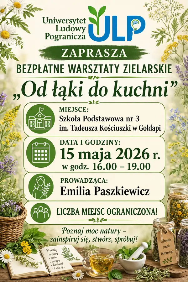Pierwsze spotkanie odbędzie się 23 kwietnia w sali nr 106 Szkoły Podstawowej nr 3 w Gołdapi. Rozpocznie się o godzinie 16:00 i potrwa około trzech godzin. Uczestnicy poznają gatunki wiosennych ziół idealnych do domowej apteczki, zgłębią wiedzę o ich właściwościach prozdrowotnych, a także nauczą się technik prawidłowego suszenia i przetwarzania roślin, aby nie straciły swoich cennych walorów.
