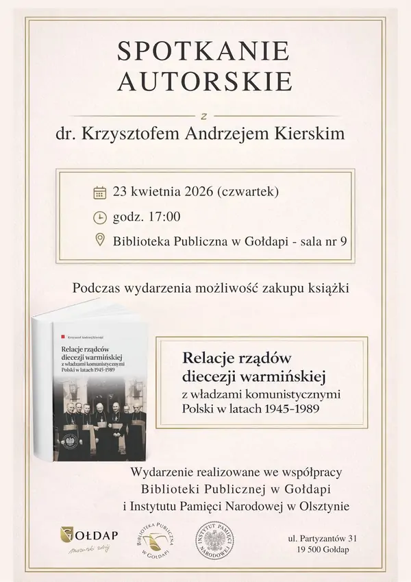 Odbędzie się ono 23 kwietnia w sali nr 9 biblioteki, początek o godzinie 17:00. Po spotkaniu będzie możliwość zakupu książki Krzysztofa Kierskiego pt. „Relacje rządców diecezji warmińskiej z władzami komunistycznymi Polski w latach 1945-1989”, w której szczegółowo opisuje trudne stosunki między Kościołem katolickim a aparatem partyjno-państwowym.