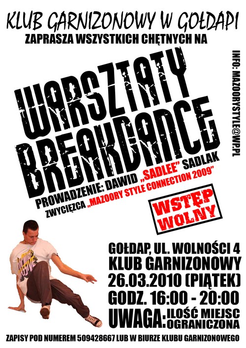 W najbliższy piątek, 26 marca, odbędą się kolejne w ostatni czasie, czterogodzinne warsztaty taneczne z zakresu tańca breakdance. Tym razem w roli instruktora wystąpi Dawid "Sadlee" Sadlak. Tancerz pochodzi z Lidzbarka Warmińskiego, na co dzień tańczy w Olsztynie z dobrze znaną formacją "Knockout Gang". W roku 2009 podczas zawodów "Mazoory Style Connection", wraz z ekipą „Sztewite Squad" zajął pierwsze miejsce. Sadlee wyróżnia się nadzwyczaj oryginalnym stylem i flava'ą, co będzie jednym z punktów piątkowych warsztatów. Wstęp na warsztaty jest darmowy, liczba miejsc, jak zawsze, ograniczona. Zapraszamy wszystkich chętnych na godzinę 16.00 do Klubu Garnizonowego przy ul. Wolności 4.