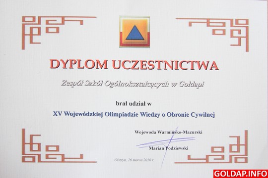 W miniony piątek w Olsztynie odbyła się XV Wojewódzka Olimpiada Wiedzy o Obronie Cywilnej. Powiat gołdapski reprezentowała drużyna z Liceum Ogólnokształcącego, w składzie Mateusz Kreczko i Grzegorz Twarowski. Została ona wyłoniona w eliminacjach powiatowych, które odbyły się 10 marca w starostwie.