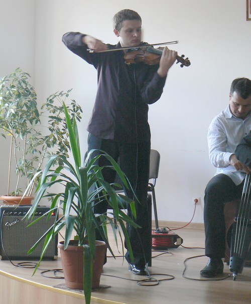 Zespół ten to, jakby na przekór nazwie, pięciu muzyków grających na różnych instrumentach: skrzypcach, akordeonie, kontrabasie elektronicznym (najbardziej intrygujący instrument tego koncertu), perkusji i klarnecie. Wszyscy panowie mają wyższe wykształcenie muzyczne, a kiedy zajrzałam na oficjalną stronę tego zespołu dowiedziałam się, że bardzo aktywnie uczestniczą w życiu artystycznym społeczeństwa naszego kraju. Jakże więc jestem dumna, iż taki zespół zawitał do Szkoły Muzycznej i mogliśmy uczestniczyć we wspaniałej duchowej uczcie.