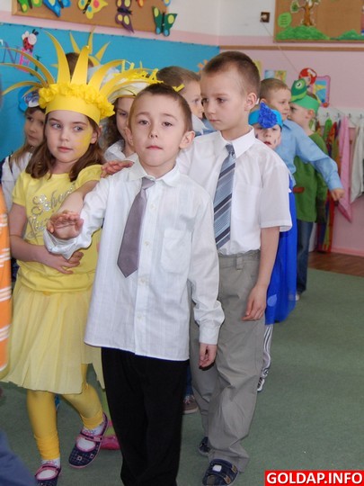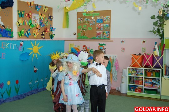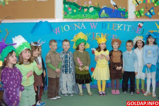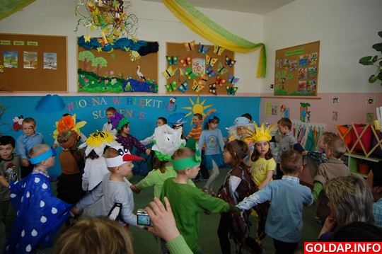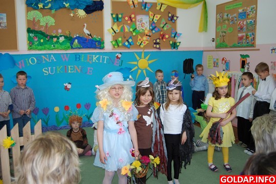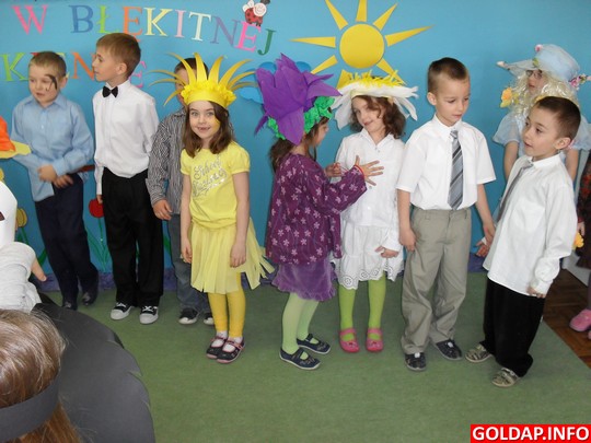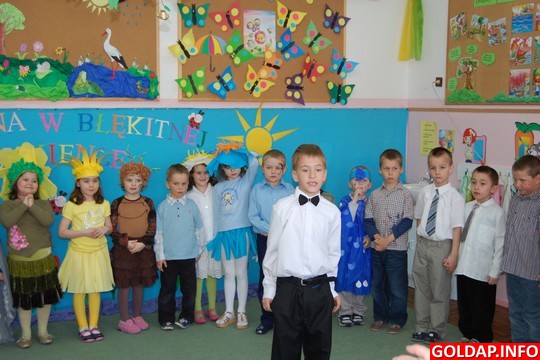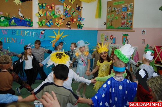 Najmłodsi uczniowie pod kierunkiem wychowawczyni S. Ostrowskiej i stażystki G. Karpińskiej przygotowali piękne stroje, wspaniałą wiosenną scenografię, wiersze, piosenki i układy taneczne. Najbardziej wyróżniał się strój Pani Wiosny, bo ona tego dnia była najważniejsza.