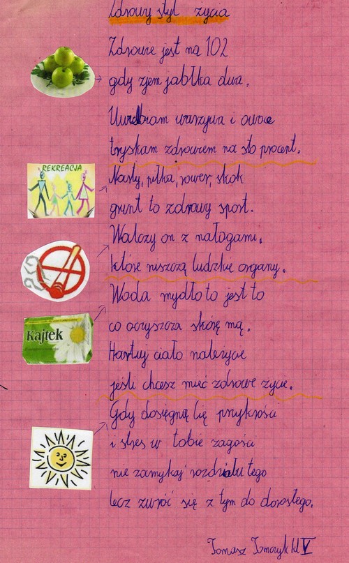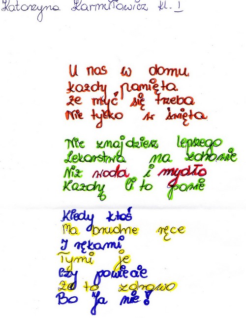 W szkole zostały też rozstrzygnięte dwa konkursy. Pierwszy, plastyczny pn. „Jestem zdrowy ponieważ...", skierowany był do dla grup przedszkolnych. Najciekawsze prace wykonały Magdalena Żamojtuk (3-4 latki), Maja Laskowska (5-6 latki) oraz Weronika Kołodziejczyk (5-6 latki). Drugi polegał na napisaniu wiersza o tematyce zdrowotnej i skierowany był do uczniów z klas I-VI. Poniżej zamieszczamy zwycięskie wiersze napisane przez Katarzynę Karmiłowicz z klasy I oraz Tomasza Tomczyka z klasy V.