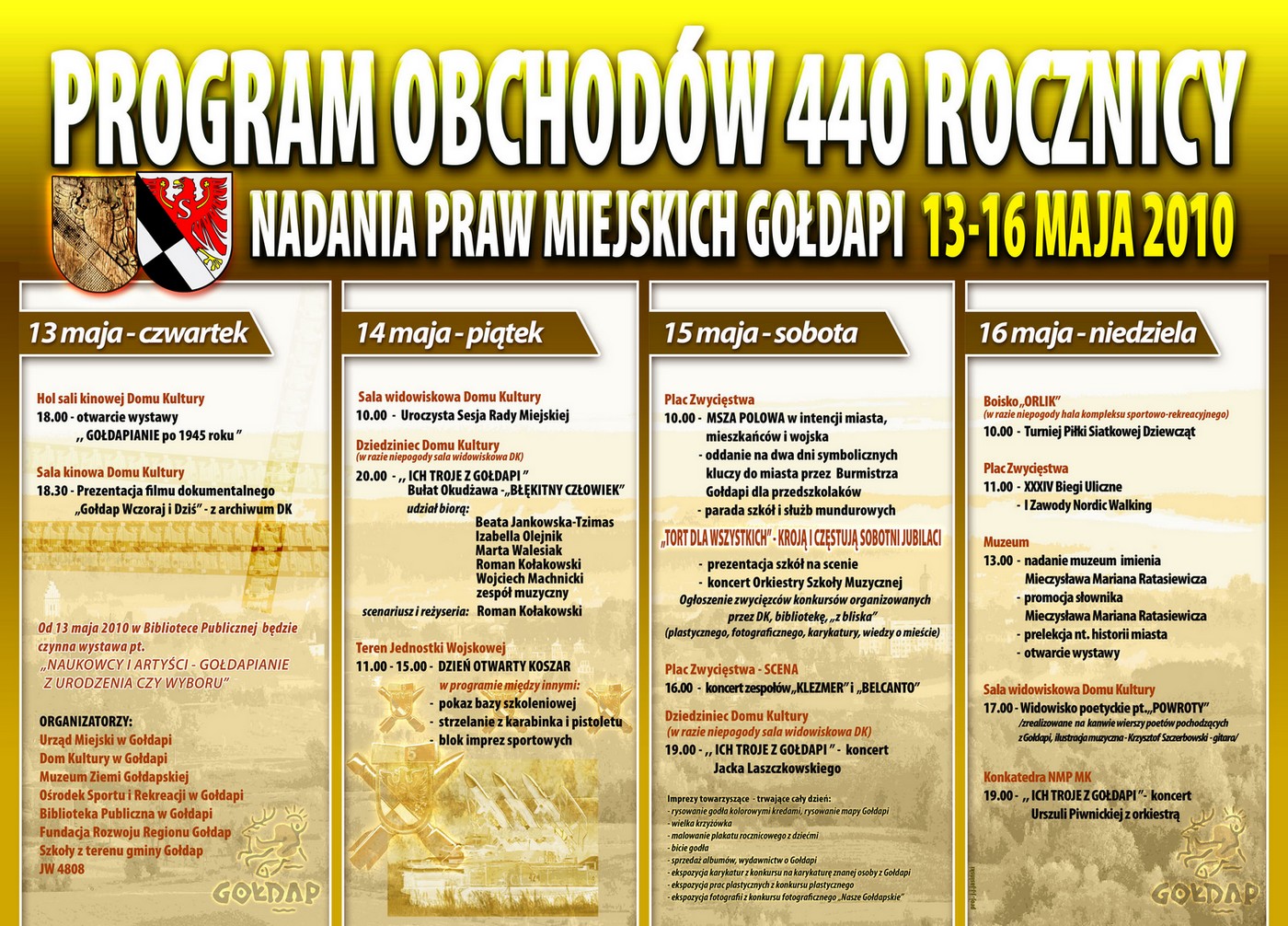 Od 13 go 16 maja odbywać się będą uroczystości związane 440 rocznicą nadania Gołdapi praw miejskich. Zapraszamy z zapoznania się ostatecznym planem tych obchodów.