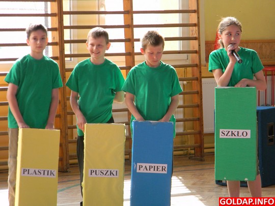 „... Ej człowieku! Zrozum w końcu, każdy czyn swą wagę ma, zanim zrobisz, najpierw pomyśl! Ratuj siebie, ratuj wszystkich nas..."- tak śpiewały Klaudia i Zuzia z klasy Vb, chcąc obudzić wrażliwość ekologiczną ludzi. Prezentując inscenizację pt.: „Wysypisko śmieci" potępiono wyrzucanie odpadów na wysypisko śmieci. Odpady: szklana butelka, reklamówka, gazeta, puszka, leżąc w tym okropnym miejscu były oburzone i wyrażały swój protest przeciwko takiemu traktowaniu śmieci. Szukały wyjścia z tej sytuacji. Oczywiście znalazły wspaniały pomysł - recykling odpadów. W tym celu zorganizowano pojemniki do segregacji śmieci. Te przedstawiły się i objaśniły, co do danego pojemnika można wrzucać. Na zakończenie chętne dzieci zrobiły porządek segregując odpady.