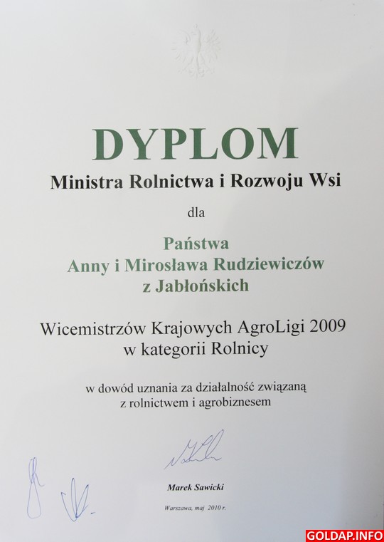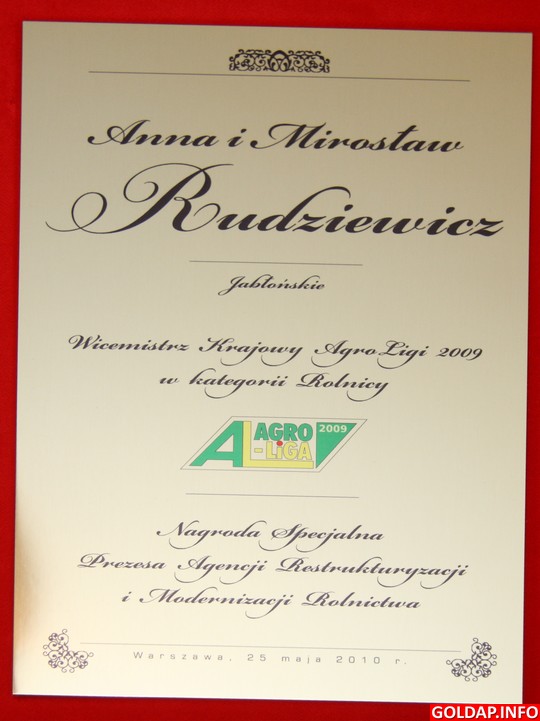Wczoraj w Belwederze, z udziałem p.o. prezydenta RP Bronisława Komorowskiego, odbyło się uroczyste podsumowanie ogólnopolskiego konkursu AgroLiga 2009. Mistrzami krajowymi w kategorii „Rolnicy" zostali państwo Anna i Marian Nowakowie z Grabowa (zachodniopomorskie), zaś w kategorii „Firmy" producent pasz, firma „Wipasz" z Wadąga (warmińsko-mazurskie). Podczas uroczystości był też gołdapski akcent, bowiem wicemistrzami kraju w pierwszej kategorii zostali Anna i Mirosław Rudziewiczowie.