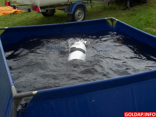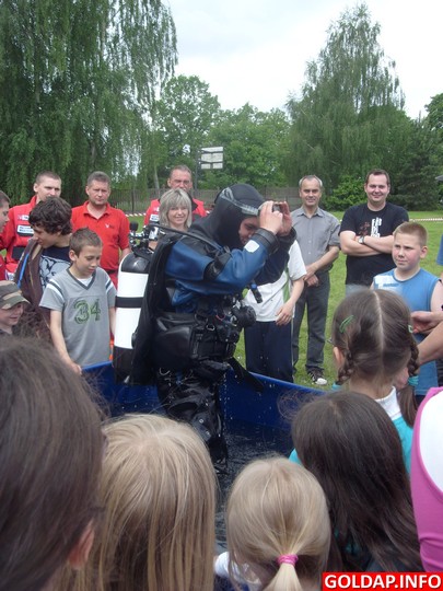 Pół godziny później umiejętności i sprzęt zaprezentowali strażacy z Państwowej Straży Pożarnej w Gołdapi. Pokazali, jak ratuje się osoby poszkodowane z płonącego samochodu. Pokaz ten komentował oraz zawiłości działań wyjaśniał kpt. Lech Olszewski, dowódca Jednostki Ratowniczko-Gaśniczej. Podczas prezentacji zjawili się także ratownicy medyczni, którzy w prawdziwych działaniach najczęściej przejmują od strażaków ranne osoby. Zgromadzeni obejrzeli również nurka podczas pracy oraz dowiedzieli się, jak wygląda sprzęt przez niego używany. Za zakończenie swojej prezentacji strażacy pokazali, jak działa nowy podnośnik, który od niedawna jest na stanie gołdapskiej jednostki.