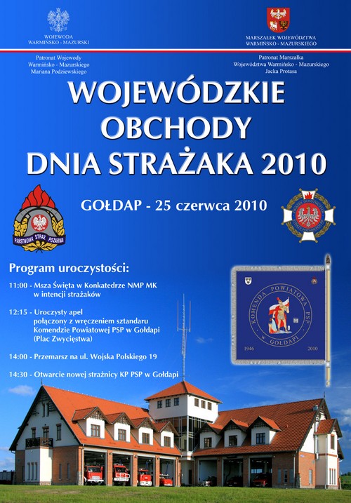 W najbliższy piątek w Gołdapi odbędą się wojewódzkie obchody Dnia Strażaka. Uroczystości rozpoczną się o godzinie 11.00 mszą świętą w kościele NMP MK, odprawioną w intencji strażaków. Po niej (ok. 12.15) na Placu Zwycięstwa odbędzie się uroczysty apel, podczas którego Komendzie Powiatowej PSP wręczony zostanie sztandar. O godzinie 14.00 uczestnicy apelu przeniosą się na ul. Wojska Polskiego 19, gdzie uroczyście otwarta zostanie nowa strażnica.