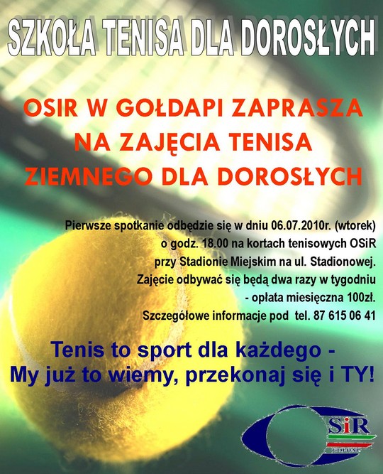 Ośrodek Sportu i Rekreacji zaprasza na zajęcia tenisa ziemnego dla dorosłych. Pierwsze, organizacyjne spotkanie, odbędzie się we wtorek (06/07) o godzinie 18.00 na kortach OSiR przy ul. Stadionowej. Zajęcia odbywać się będą dwa razy z tygodniu. Szczegółowe informacje można uzyskać pod nr telefonu 876-150-641.