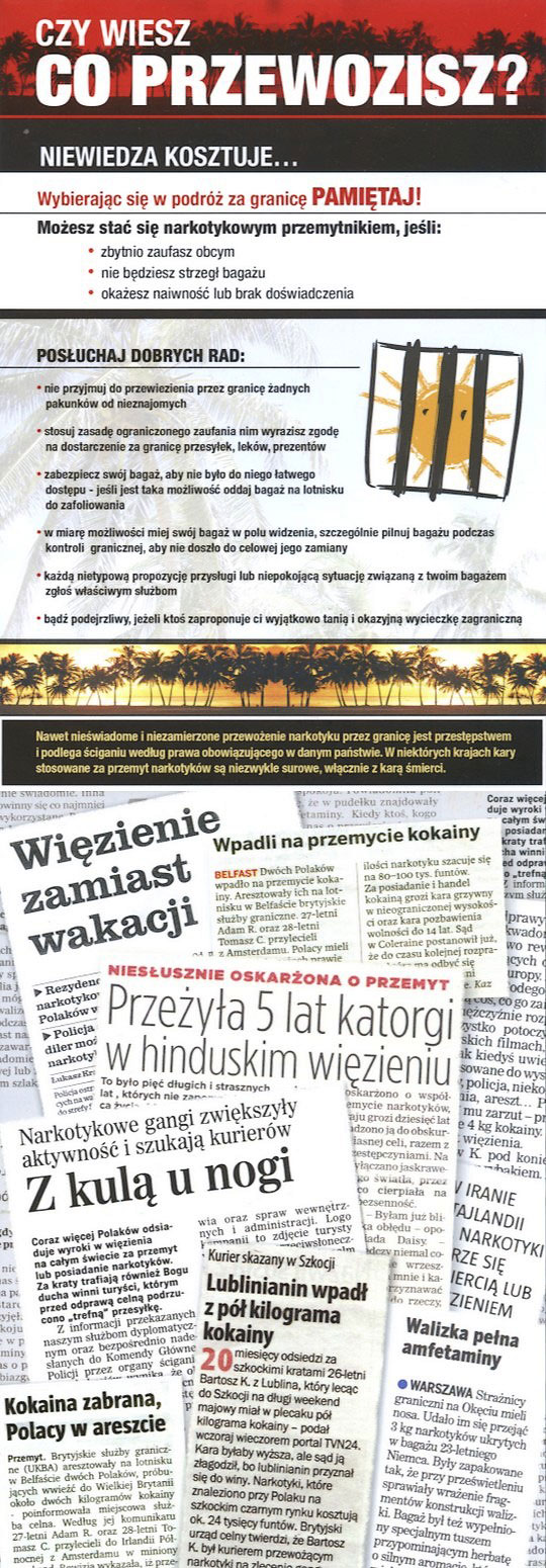 Pod patronatem ministra zdrowia i ministra SWiA prowadzona jest kampania pn. „Czy wiesz. co przewozisz". Turyści otrzymują m.in. ulotki, na których są przedstawione „dobre rady". Jeśli wyjeżdżają Państwo za granicę, warto się z nimi zapoznać.