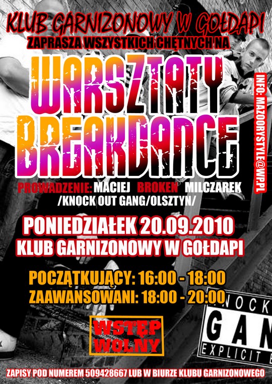 Już 20 września zapraszamy do Klubu Garnizonowego (ul. Wolności 6) na prawdopodobnie ostatnie warsztaty z zakresu tańca breakdance w tym roku. Tym razem poprowadzi je Maciej Milczarek czyli b-boy Broken! To reprezentant olsztyńskiej grupy "Knock Out Gang", która "pozamiatała" tegoroczne "Mazoory Style Connection" i ostatecznie wygrała całe zawody.