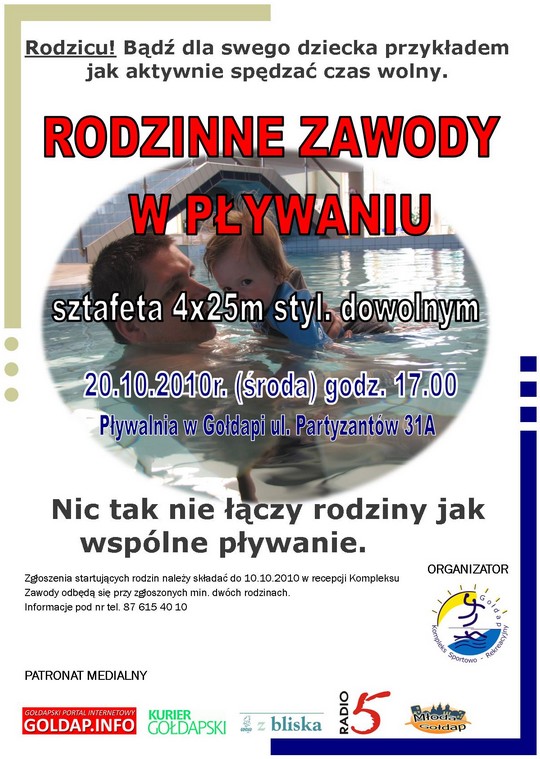 Kompleks Sportowo-Rekreacyjny zaprasza chętne rodziny do wzięcia udziału w Rodzinnych Zawodach w Pływaniu. Zorganizowane one zostaną z okazji IV urodzin kompleksu, które odbędą się 20 października. Zgłoszenia należy składać do 10 października w recepcji kompleksu.
