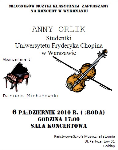 Państwowa Szkoła Muzyczna I stopnia zaprasza miłośników muzyki klasycznej na koncert Anny Orlik, studentki Uniwersytetu im. Fryderyka Chopina w Warszawie. Odbędzie się on 6 października o godzinie 17.00 w sali koncertowej szkoły muzycznej.