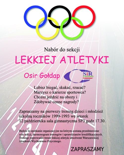 Ośrodek Sportu i Rekreacji w Gołdapi zaprasza dzieci i młodzież szkolną, urodzoną w latach 1993-1999, do zapisywania się do sekcji lekkiej atletyki. Spotkanie organizacyjne i pierwszy trening odbędzie się 12 października o godzinie 17.30 w sali gimnastycznej w SP3.