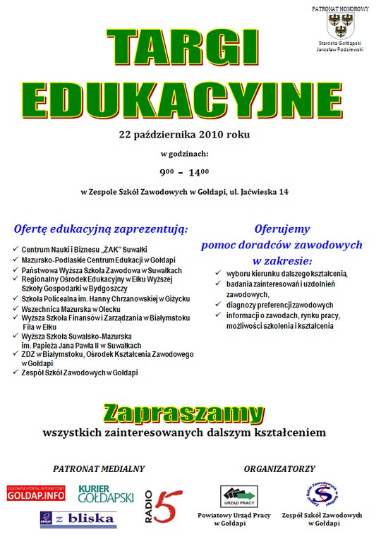 - 9.00-9.10 Powitanie gości. Inauguracja Targów Edukacyjnych zorganizowanych w ramach Ogólnopolskiego Tygodnia Kariery (Mirosława Równa, dyrektor ZSZ w Gołdapi i Wojciech Hołdyński, dyrektor PUP w Gołdapi)