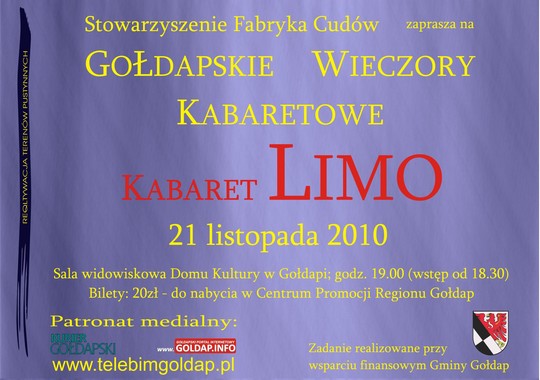 Bilety na występ kabaretu „Limo", w cenie 20zł, są już do nabycia w Centrum Promocji Regionu Gołdap (pl. Zwycięstwa 16). Zapraszamy!