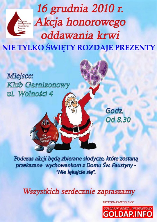 Gołdapskie Stowarzyszenie Honorowych Dawców Krwi zaprasza na ostatnią w tym roku akcję krwiodawczą. Odbędzie się ona jak zawsze w Klubie Garnizonowym w Gołdapi, początek o godzinie 8.30.