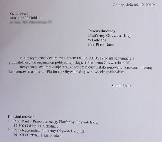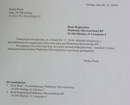 Stefan Piech wyjaśnił dziś w rozmowie ze mną, a następnie także na sesji Rady Powiatu, że rezygnację z członkostwa w PO złożył z dniem 6 grudnia br. Stosowne pisma wysłał do Rady Regionalnej PO w Olsztynie oraz do Piotra Ranta, szefa gołdapskich struktur PO.