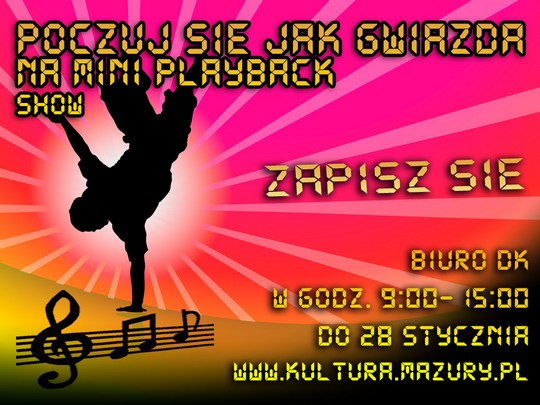 Dom Kultury zaprasza dzieci i młodzież do wzięcia udziału w konkursie „Mini Playback Show". Zapisy chętnych do występu młodych artystów przyjmowane są w Biurze Domu Kultury do 28 stycznia.
