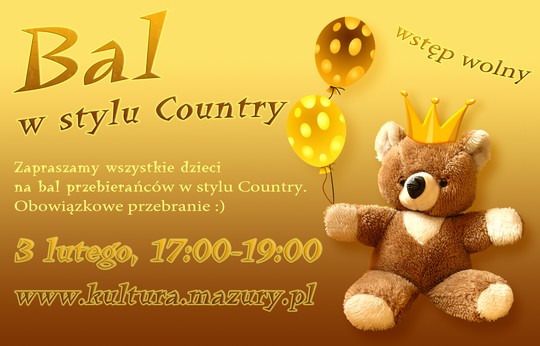 Dom Kultury zaprasza wszystkie dzieci 3 lutego w godz. 17.00-19.00 na bal przebierańców w stylu country. Odbędzie się on w sali widowiskowej Domu Kultury. Warunkiem uczestnictwa w balu jest ciekawy kostium lub maska w stylu dzikiego zachodu. Wstęp bezpłatny.