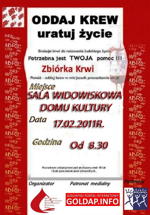 Zapraszamy Państwa na drugą tym roku akcję krwiodawczą. Odbędzie się ona w najbliższy czwartek w sali widowiskowej Domu Kultury. Początek o godzinie 8.30.