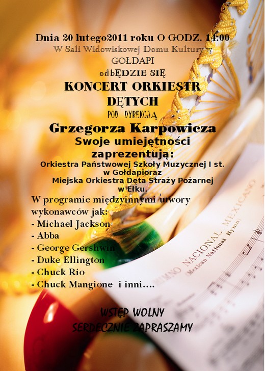 20 lutego w sali widowiskowej Domu Kultury odbędzie się koncert orkiestr dętych pod dyrekcja Grzegorzą Karpowicza. Swoje umiejętności zaprezentują: Orkiestra Państwowej Szkoły Muzycznej I st. w Gołdapi oraz Miejska Orkiestra Dęta Straży Pożarnej w Ełku. Początek koncertu o godzinie 14.00. Wstęp bezpłatny.