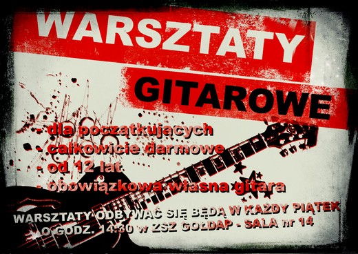 Samorząd Uczniowski w Zespole Szkół Zawodowych w Gołdapi zaprasza na darmowe warsztaty gitarowe. Zaproszenie skierowane jest do wszystkich zainteresowanych w wieku od 12 lat. Mile widziana własna gitara.