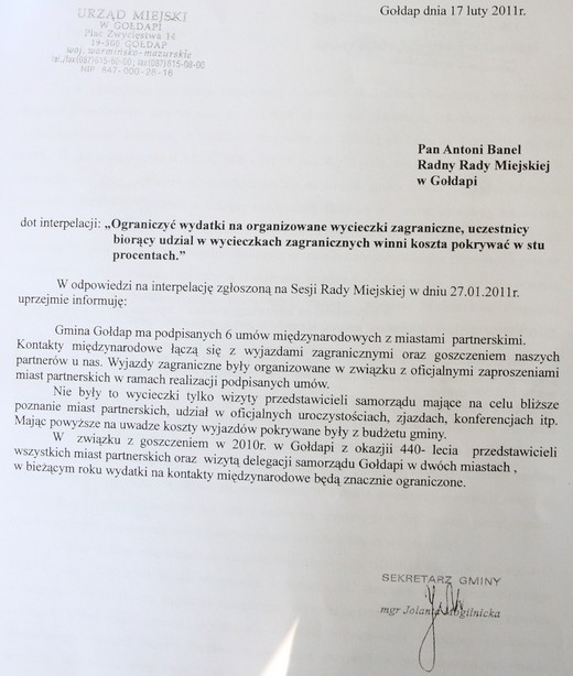 W styczniu na sesji Rady Miejskiej radny Antonii Banel złożył interpelację, aby ograniczyć wydatki na - jak to ujął radny - organizowanie tzw. wycieczek zagranicznych. Oto odpowiedź sekretarza gminy Jolanty Mogilnickiej.