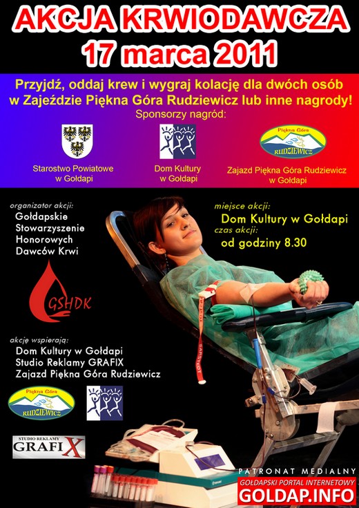 Zapraszamy Państwa na najbliższą akcję krwiodawczą, organizowaną przez Gołdapskie Stowarzyszenie Honorowych Dawców Krwi. Odbędzie się ona 17 marca w sali widowiskowej Domu Kultury, początek o godzinie 8.30.