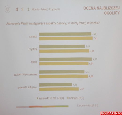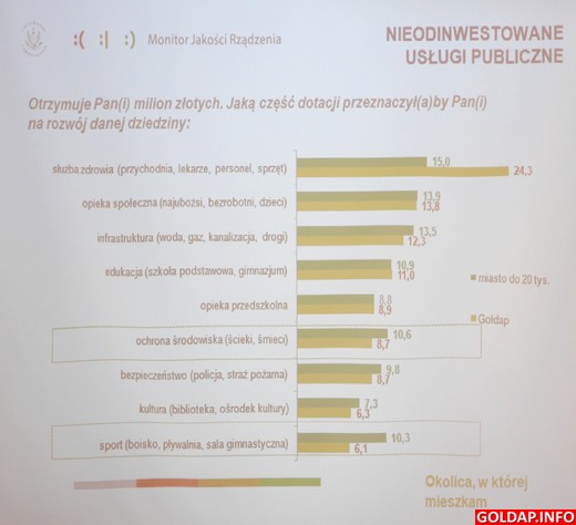 Z przeprowadzonego badania wynika też, że zdaniem gołdapian np. lokalna służba zdrowia (przychodnie, lekarze, sprzęt) jest niedofinansowana, za to nie ma już potrzeby inwestowania w sport (boiska, sale gimnastyczne, pływalnie).