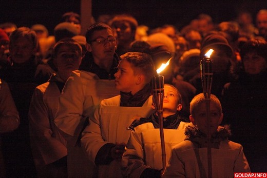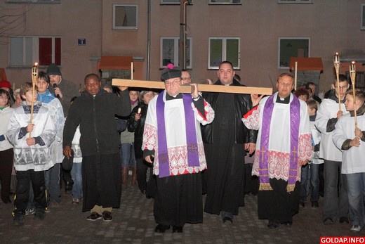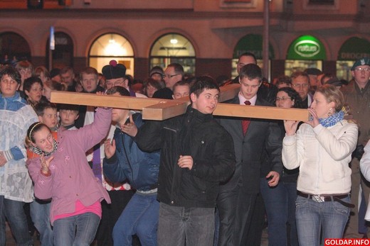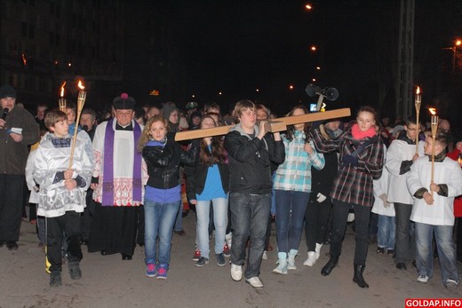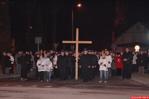Kilkaset osób wzięło dziś udział w Drodze Krzyżowej, która przeszła wieczorem ulicami Gołdapi od kościoła św. Leona i Bonifacego do kościoła Najświętszej Maryi Panny Matki Kościoła. Krzyż nieśli zarówno władze samorządowe, służby mundurowe, kapłani, jak i zwykli mieszkańcy miasta. Nad bezpieczeństwem na drogach czuwali gołdapscy policjanci. Uroczystość zakończyła się komunią świętą oraz „Barką", ulubioną pieśnią papieża Polaka Jana Pawła II.