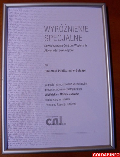 Wczoraj Biblioteka Publiczna w Gołdapi otrzymała wyróżnienie specjalne przyznane przez Stowarzyszenie Centrum Wspierania Aktywności Lokalnej CAL w Warszawie. Konferencja miała miejsce w Wojewódzkiej Bibliotece Publicznej w Olsztynie, odbywała się pod hasłem „Biblioteka - miejsce aktywne". W spotkaniu uczestniczyli przedstawiciele władz województwa czyli pełnomocnik wojewody warmińsko-mazurskiego ds. kontaktów międzynarodowych, protokołu dyplomatycznego i kultury Bogusław Osiński, przedstawiciel Fundacji Rozwoju Społeczeństwa Informacyjnego w Warszawie Magdalena Kubecka, wiceprezes Stowarzyszenia Centrum Wspierania Aktywności Lokalnej CAL w Warszawie Grażyna Gnatowska, wicedyrektor WBP w Olsztynie Wiesława Borkowska-Nichthauser oraz dyrektorzy i przedstawiciele bibliotek województwa warmińsko-mazurskiego biorące udział w Programie Rozwoju Bibliotek jako biblioteki wiodące i partnerskie.