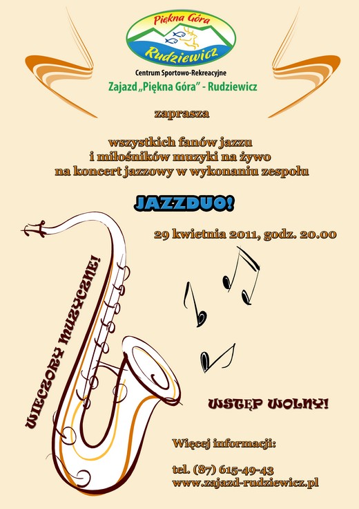 Zajazd Piękna Góra Rudziewicz zaprasza na kolejny „Piątkowy wieczór z muzyką", który odbędzie się 29 kwietnia. Tym razem będzie jazzowo. Przed publicznością zaprezentuje sie zespół Jazzduo. Początek koncertu o godzinie 20.00, wstęp bezpłatny.