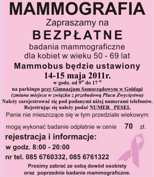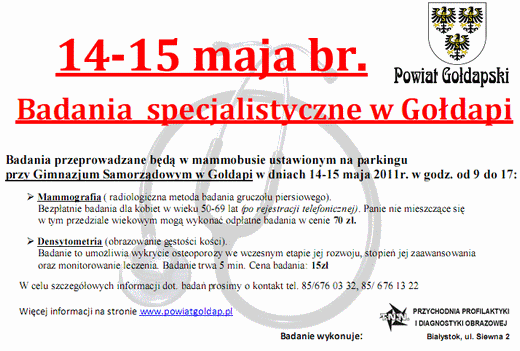 Przed świętami informowaliśmy Państwa o tym, że w połowie maja w Gołdapi będzie można wykonać badania mammograficzne. Okazuje się, że oprócz nich można będzie też zbadać gęstość kości. Dzięki temu badaniu możliwe jest wykrycie osteoporozy we wczesnym etapie jej rozwoju.