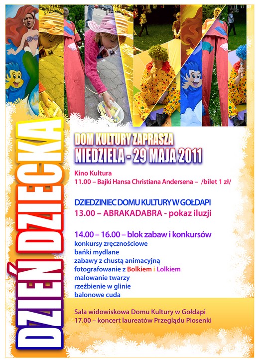 Zbliża się Dzień Dziecka. Dom Kultury w Gołdapi przygotowuje z tej okazji cykl imprez, które odbędą się w niedzielę, 29 maja. Dzieci będą mogły obejrzeć w Kinie „Kultura" bajki H. Ch. Andersena, będzie też pokaz iluzji oraz różne gry i zabawy. Szczegóły na plakacie.