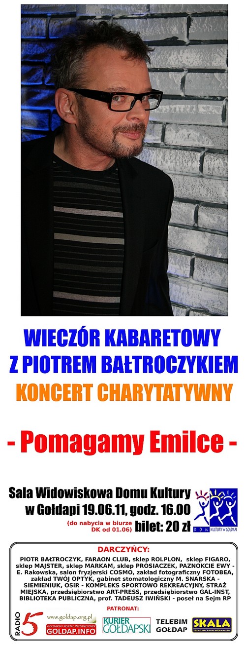 Od dziś w biurze Domu Kultury do nabycia są bilety na koncert charytatywny z udziałem Piotra Bałtroczyka, który odbędzie się 19 czerwca o godzinie 16.00. Dochód z koncertu oraz z przeprowadzonych w jego trakcie licytacji przeznaczony zostanie na pomoc Emilii Kramkowskiej.