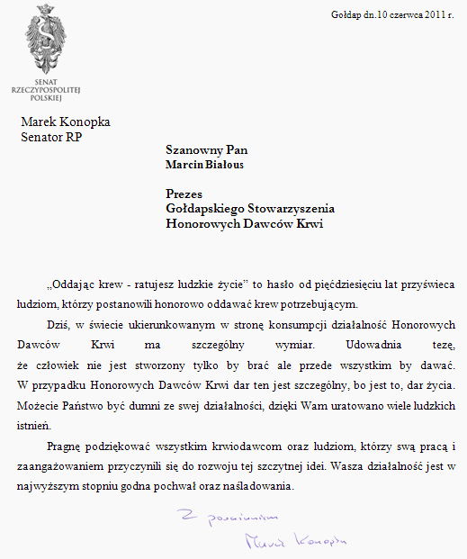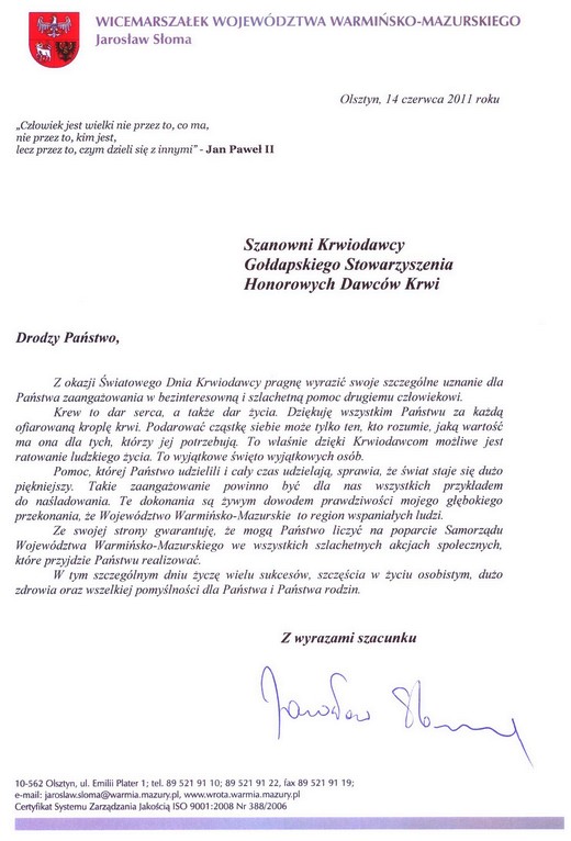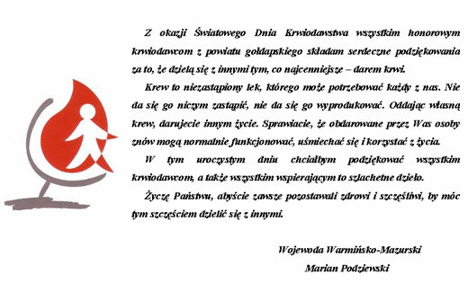 Tak jak na boisku liczy się rozegranie dobrego pojedynku, jest gra o zwycięstwo, są emocje i pasjonujące się tłumy, tak Wy, oddając krew „walczycie” o życie innych. Na co dzień jednak pozostajecie w cieniu zwycięstwa chorych - zdanych na Waszą ofiarność... Z okazji Światowego Dnia Krwiodawcy wszystkim Gołdapskim Krwiodawcom życzę wielu sukcesów w życiu osobistym oraz dalszego bezinteresownego zaangażowania w „grę”, jaką jest rozdawanie nadziei w każdej oddanej kropli krwi.