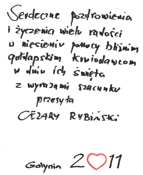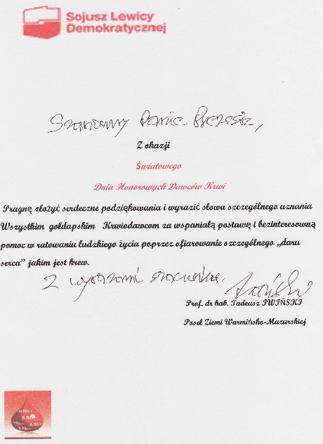 Przekazuję też życzenia gołdapskim krwiodawcom, jakie wpłynęły na moje ręce. Za wszystkie w imieniu stowarzyszenia i nas wszystkich serdecznie dziękuję.