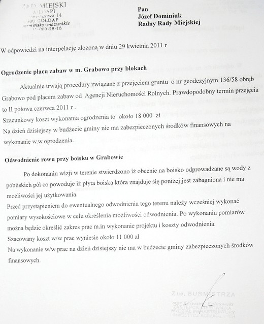 W kwietniu radny Józef Dominiuk złożył wniosek o ogrodzenie placu zabaw oraz o odwodnienie boiska przy blokach w Grabowie. Jak wynika z odpowiedzi Krzysztofa Kalinowskiego, zastępcy kierownika wydziału infrastruktury i inwestycji komunalnych w Urzędzie Miejskim, na dzień dzisiejszy nie ma na to co liczyć. Powodem jest brak środków w budżecie gminy.