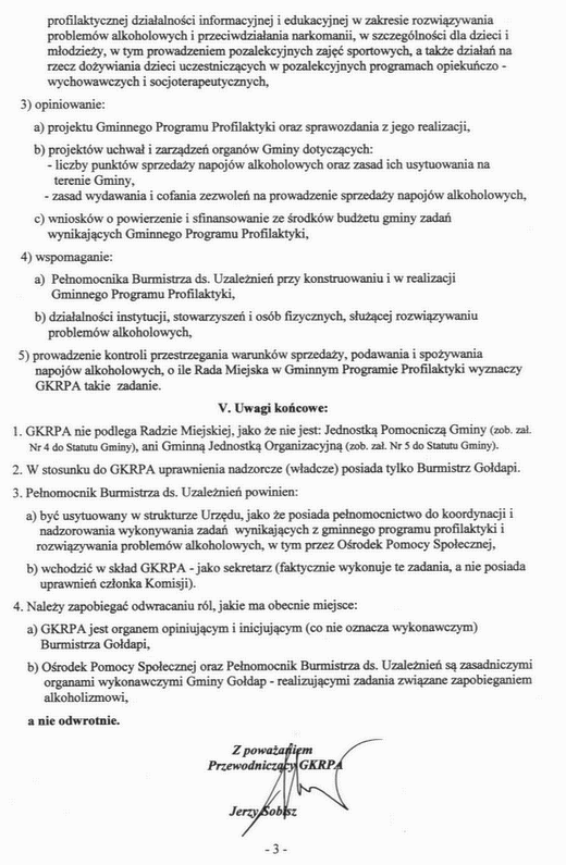 Jerzy Sobisz zarzucił nieobecnej na posiedzeniu dyrektor Ośrodka Pomocy Społecznej niewłaściwe traktowanie jego komisji. Uważa on, że Agnieszka Iwanowska „podchodzi do GKRPA tak, jakby była jej zwierzchnikiem (organem nadzoru), nie zważając na to, że komisja jest organem opiniodawczym burmistrza i inicjującym wykonanie Gminnego Programu Profilaktyki, a uprawnienia nadzorcze (władcze) nad nią posiada tylko burmistrz Gołdapi".