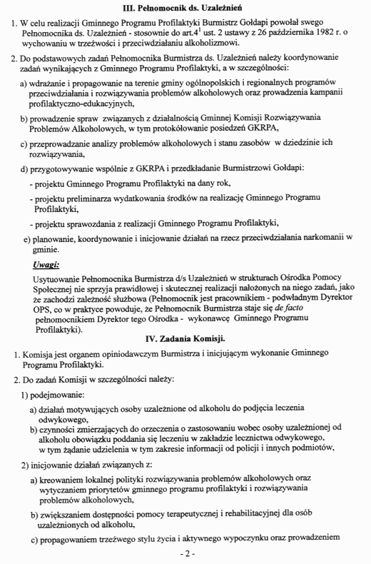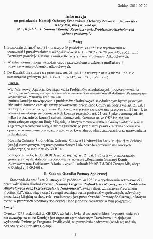 Radni z komisji środowiska, ochrony zdrowia i uzdrowiska przy Radzie Miejskiej chcieli dziś wysłuchać informacji przewodniczącego gminnej komisji rozwiązywania problemów alkoholowych Jerzego Sobisza z działalności komisji i problemów, z jakimi się spotyka. Jerzy Sobisz na początku spotkania z komisją Rady Miejskiej odczytał przygotowany wcześniej dokument. Wyjaśnił w nim, że jego komisja nie podlega Radzie Miejskiej, nie jest jednostką pomocniczą gminy, nie jest też gminną jednostką organizacyjną, a uprawnienia nadzorcze posiada jedynie burmistrz Gołdapi. Poinformował również, kto może być członkiem komisji, jakie są zadania jej, Ośrodka Pomocy Społecznej i pełnomocnika burmistrza ds. uzależnień.