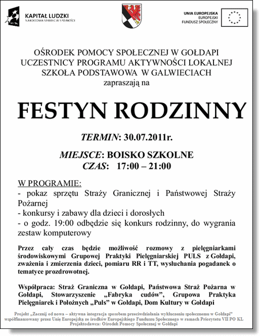 30 lipca w godzinach 17.00-20.00 na boisku szkolnym w Galwieciach odbędzie się festyn rodzinny. W programie pokaz sprzętu Straży Granicznej i Państwowej Straży Pożarnej, konkursy i zabawy dla dzieci oraz dorosłych. O godz. 19.00 odbędzie się konkurs rodzinny, w którym do wygrania będzie zestaw komputerowy.