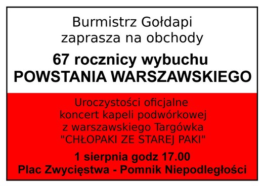 Burmistrz Gołdapi zaprasza na obchody 67 rocznicy Powstania Warszawskiego. Odbędą się one dziś o godzinie 17.00. przy Pomniku Niepodległości. W programie obchodów oprócz części oficjalnej zapanowano występ warszawskiej kapeli podwórkowej „Chłopaki ze starej paki".