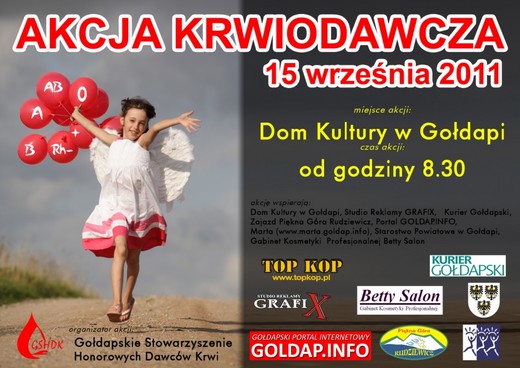 Jutro w sali widowiskowej Domu Kultury odbędzie się kolejna, comiesięczna akcja krwiodawcza, organizowana przez Gołdapskie Stowarzyszenie Honorowych Dawców Krwi. Chętnych oddać krew zapraszamy w od godziny 8.30. Podczas akcji będą zbierane słodycze oraz maskotki, które zostaną przekazane dzieciom z Domu dla Ludzi Bezdomnych i Najuboższych w Garbasie.