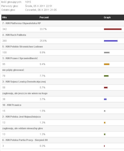 Większość sondaży przedwyborczych dotyczących wyborów do Sejmu przewiduje zwycięstwo Platformy Obywatelskiej. Niewiele niższe notowania uzyskuje Prawo i Sprawiedliwość. O trzecie miejsce „walczą" Sojusz Lewicy Demokratycznej, Polskie Stronnictwo Ludowe i Ruch Palikota. Dziś ogólnopolskie media poinformowały, że rosną notowania tego ostatniego ugrupowania. W naszej sondzie, w której mogli Państwo głosować od wczoraj przez prawie 24 godziny, oddanych zostało 1015 głosów. Zwyciężyła Platforma Obywatelska (33,7%). Drugie miejsce - chyba dość niespodziewanie - zajął Ruch Palikota (25,6%). Czyżby partia ta okazała się czarnym koniem wyborów w powiecie gołdapskim? O tym przekonamy się już w poniedziałek.