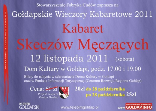 Kabaret Skeczów Męczących wystąpi 12 listopada w Gołdapi. Jest to kolejna inicjatywa Stowarzyszenia „Fabryka Cudów", które konsekwentnie od 3 lat realizuje projekt Gołdapskich Wieczorów Kabaretowych. Dotychczas na gołdapskiej scenie wystąpiły: Kabaret Dno, Grzegorz Halama, Kabaret Widelec, Kabaret Czesuaf, Kabaret Świerszczychrząszcz, Kabaret Nowaki oraz kabaret Limo.