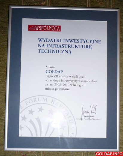 W czasie forum wręczono statuetki i dyplomy najlepszym polskim samorządom, które zajęły czołowe miejsca w rankingu zorganizowanym przez najstarsze branżowe pismo „Wspólnota". W rankingu na wydatki inwestycyjne na infrastrukturę techniczną Gołdap w swojej kategorii miast powiatowych zajęła bardzo wysokie, siódme miejsce w kraju i zdecydowanie pierwsze w województwie. To kolejny ranking potwierdzający wysoką pozycję Gołdapi wśród polskich samorządów. Dyplom odebrał burmistrz Marek Miros, który uczestniczył w forum wraz z ze skarbnik gminy Krystyną Trzasko.