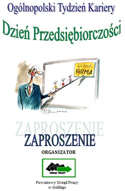 Powiatowy Urząd Pracy w Gołdapi z okazji III edycji Ogólnopolskiego Tygodnia Kariery organizuje Dzień Przedsiębiorczości. Zapraszamy wszystkich zainteresowanych założeniem własnej działalności gospodarczej 19 października 2011 roku w godzinach 10.00-13.00 do sali widowiskowej Domu Kultury w Gołdapi.