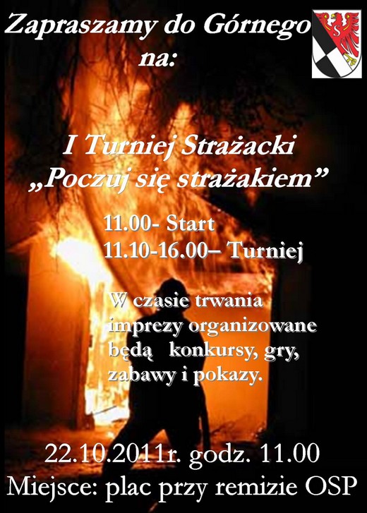 W najbliższą sobotę w Górnem odbędzie się I Turniej Strażacki "Poczuj się strażakiem". Wezmą w nim udział zawodnicy z Górnego, Dunajka i Grabowa. Początek rywalizacji o godzinie 11.00.